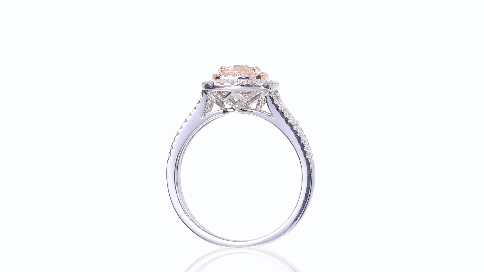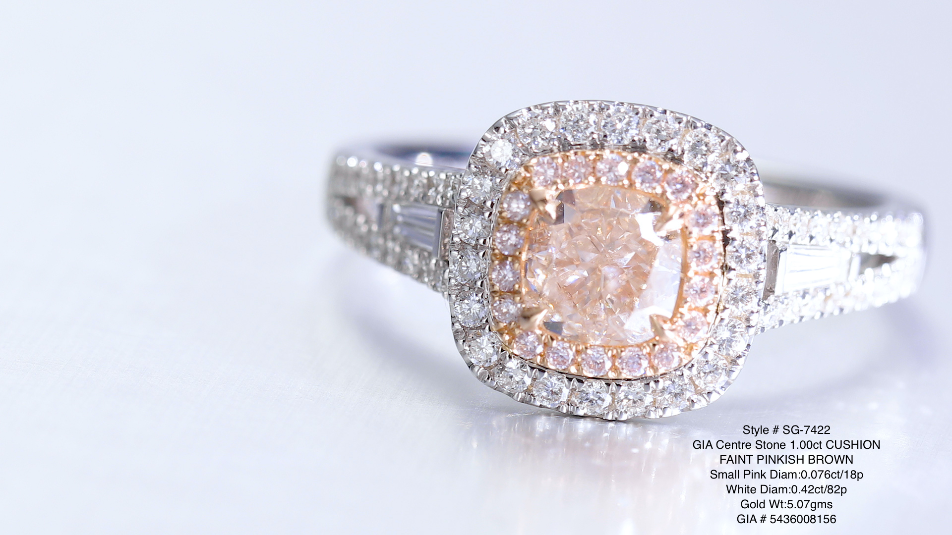 ANELLO IN ORO BIANCO 18K 5.07 GR DIAMANTE CENTRALE 1.00 CT MARRONE ROSASTRO + BRILLANTI ROSA 0.076/18P CT TOTALI + BRILLANTI PER 0.42 CT/82P COLORE D-F PUREZZA VS1 – CERTIFICATO GIA - SG-7422