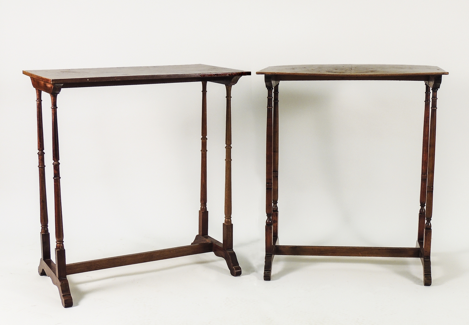 DUE TAVOLINI DA APPOGGIO IN NOCE E RADICA - TWO SMALL WALNUT AND BRIAR TABLES sostegni torniti, piedini a ricciolo h cm 74x68x40