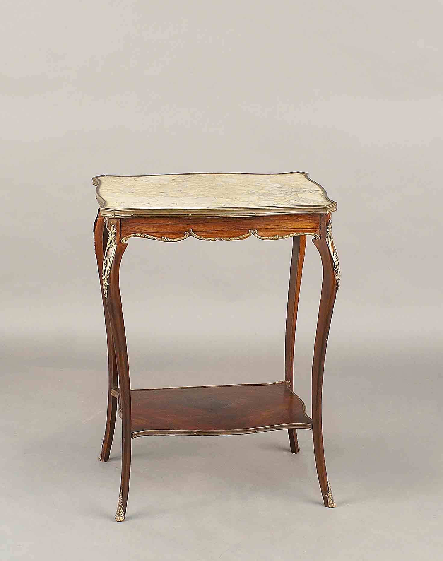 Tavolino in palissandro con applicazioni in bronzo dorato, piano sagomato in marmo, ulteriore piano sottostante, gambe di linea mossa, Francia, vecchia manifattura, cm. 74x53x39.