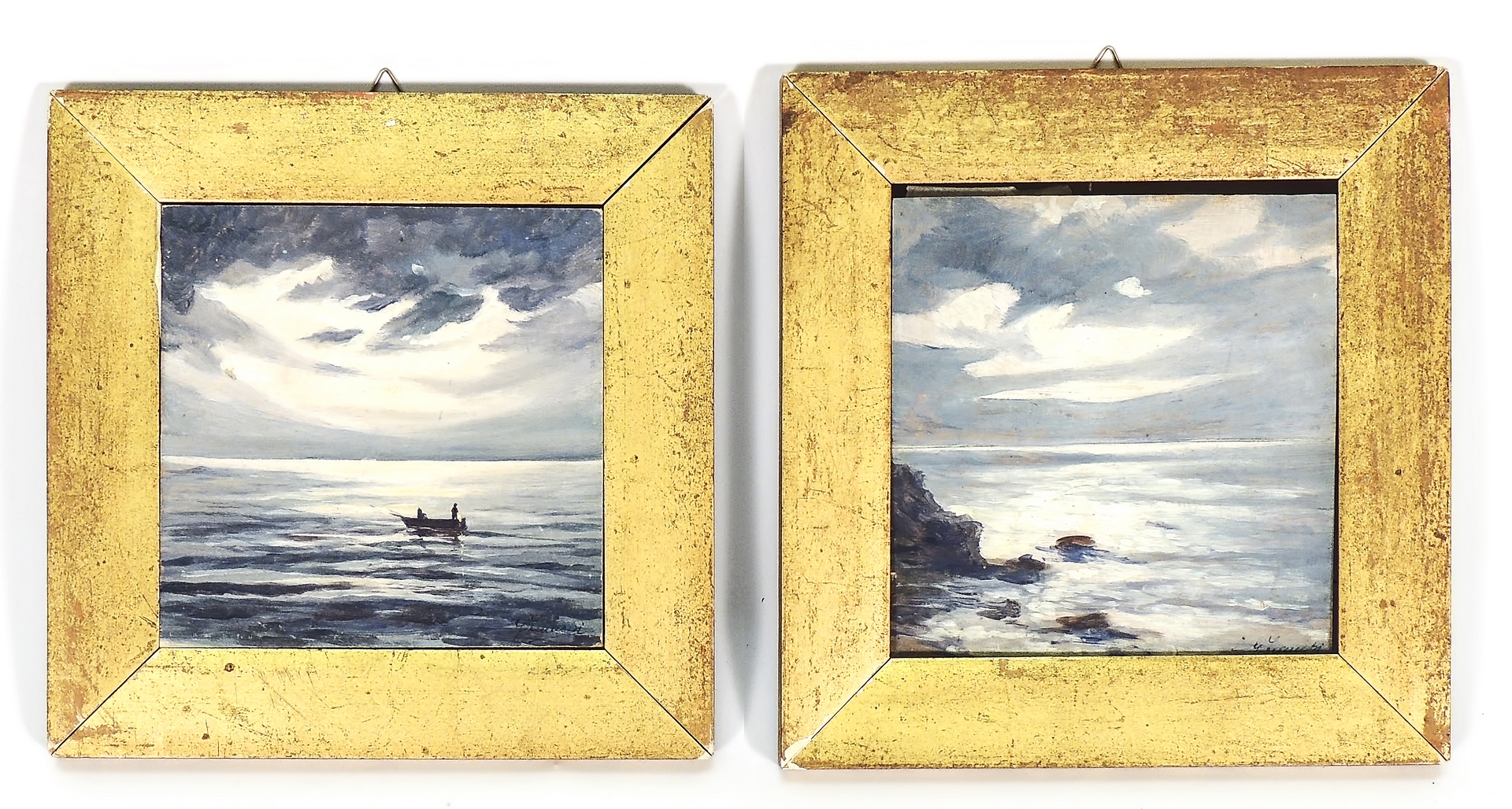 GUIDO FRANCHI (1897-1972) Marine - Seascapes due dipinti a olio su tavoletta - two oil paintings on board firmati, al verso recano etichetta con iscrizione, in cornice cm 16,5x16 e cm 15,5x16