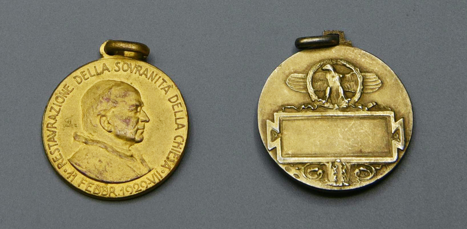 Recto: effige di profilo di Papa Pio XI, attorno RESTAURAZIONE DELLA SOVRANITA' DELLA CHIESA; al di sotto la data