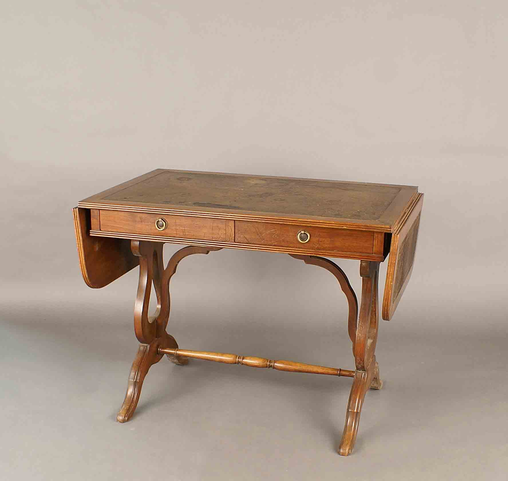 Tavolo scrittoio in mogano, piano rettangolare rivestito in cuoio con 2 tablettes laterali e 2 cassetti sottostanti poggianti su sostegni a lira riuniti al centro, Inghilterra, vecchia manifattura, cm. 77x100x65,5 (chiuso), cm. 77x160x65,5 (aperto).