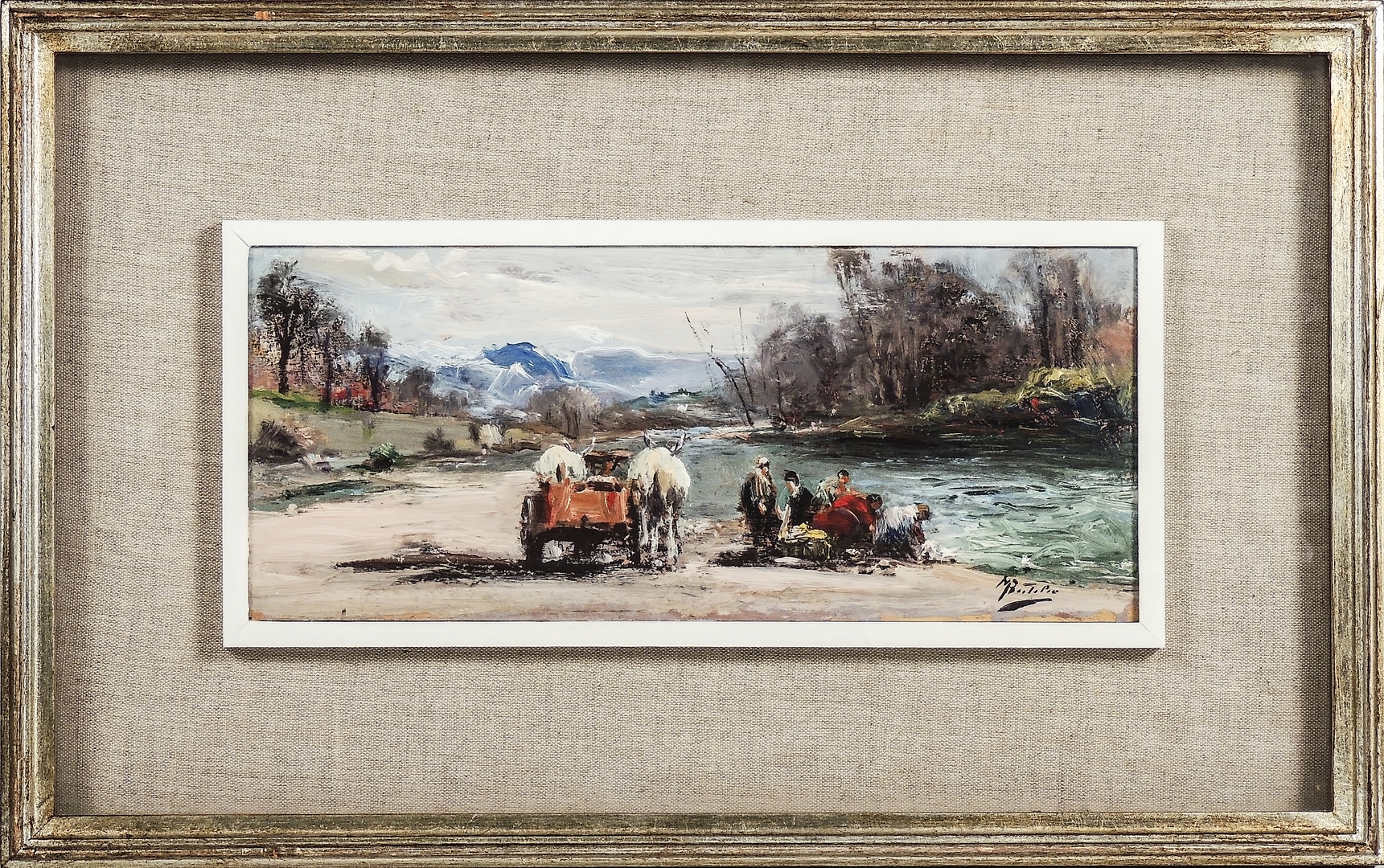 RUTILIO MUTI (1904-1995) Lavandaie sulla Sieve - Laundry Women on Sieve River olio su tavoletta - oil on panel, firmato, al verso firmato e titolato, in cornice cm 15x35