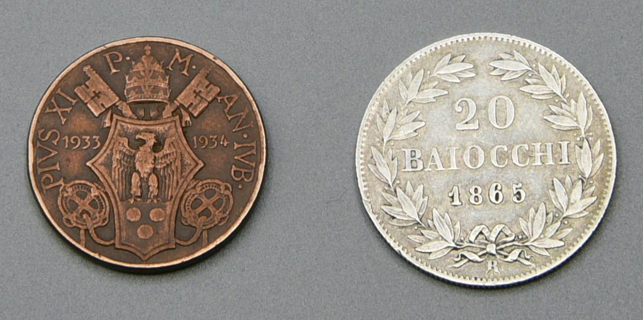 Recto: stemma di Papa Pio XI con indicati ai due lati i millesimi di conio 1933-1934; intorno: PIUS XI.PM.AN.IVB.