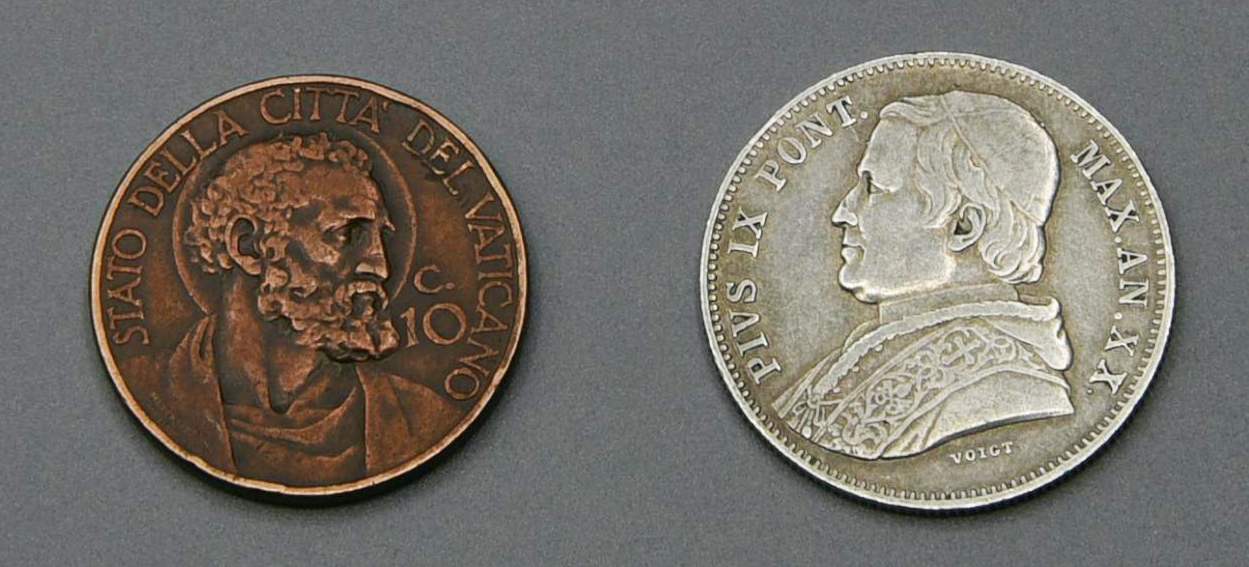 Verso: semibusto di San Pietro rivolto verso destra e valore; intorno: STATO DELLA CITTA' DEL VATICANO; al di sotto il nome dell'autore MISTRVZZI (Aurelio Mistruzzi) e dell'incisore A. MOTTI INC. (Attilio Silvio Motti)