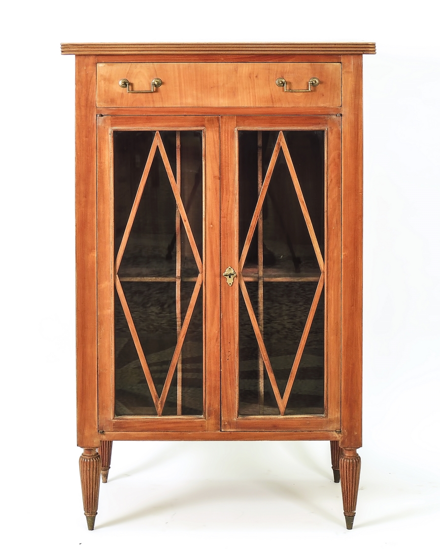 PICCOLA VETRINA IN SATINWOOD - SMALL SATINWOOD CABINET fronte dritto a due sportelli con losanghe sormantato da un cassetto, gambe a faretra scanalata h cm 113x67x38