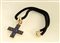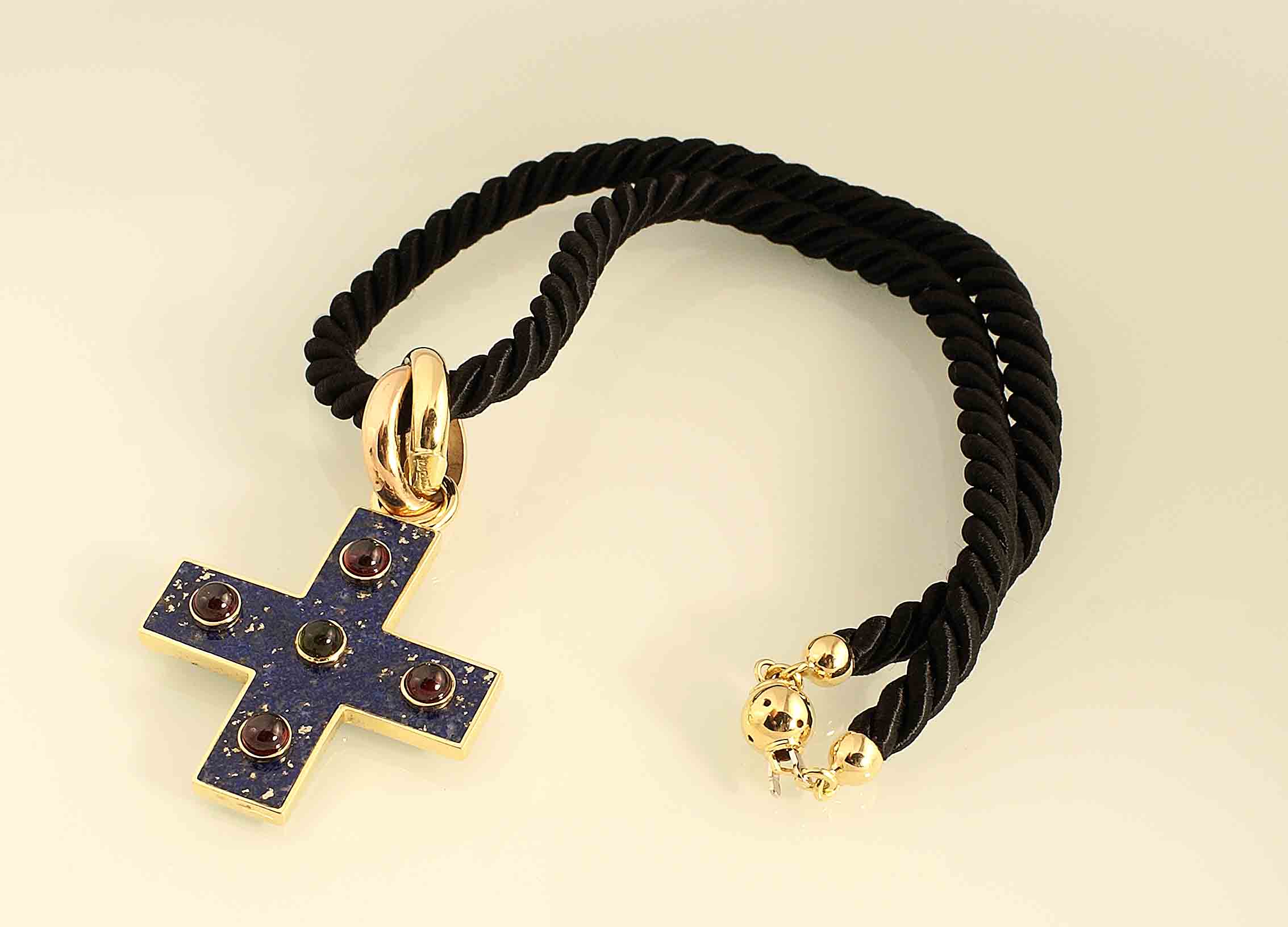 Pendente a croce in oro giallo 18kt e lapislazzulo con incastonati quattro granati e un peridoto taglio cabochon, completo di cordoncino in tessuto e oro, gr. 25 circa.