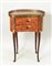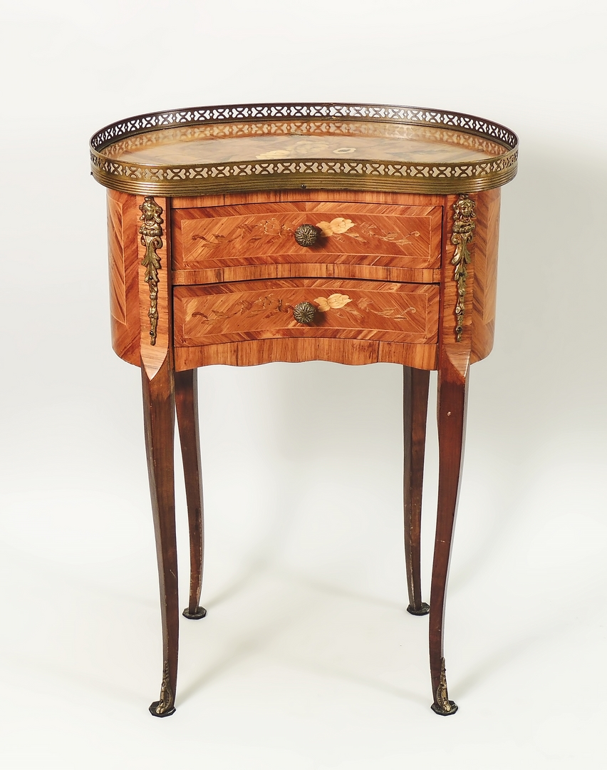 GUERIDON A FAGIOLO - KIDNEY BEAN SHAPED TABLE intarsiato in legno di rosa con filettature e motivi floreali, bordo a ringhiera e applicazioni in bronzo dorato, due cassetti sul fronte, gambe mosse h cm 66,5x47x26