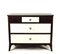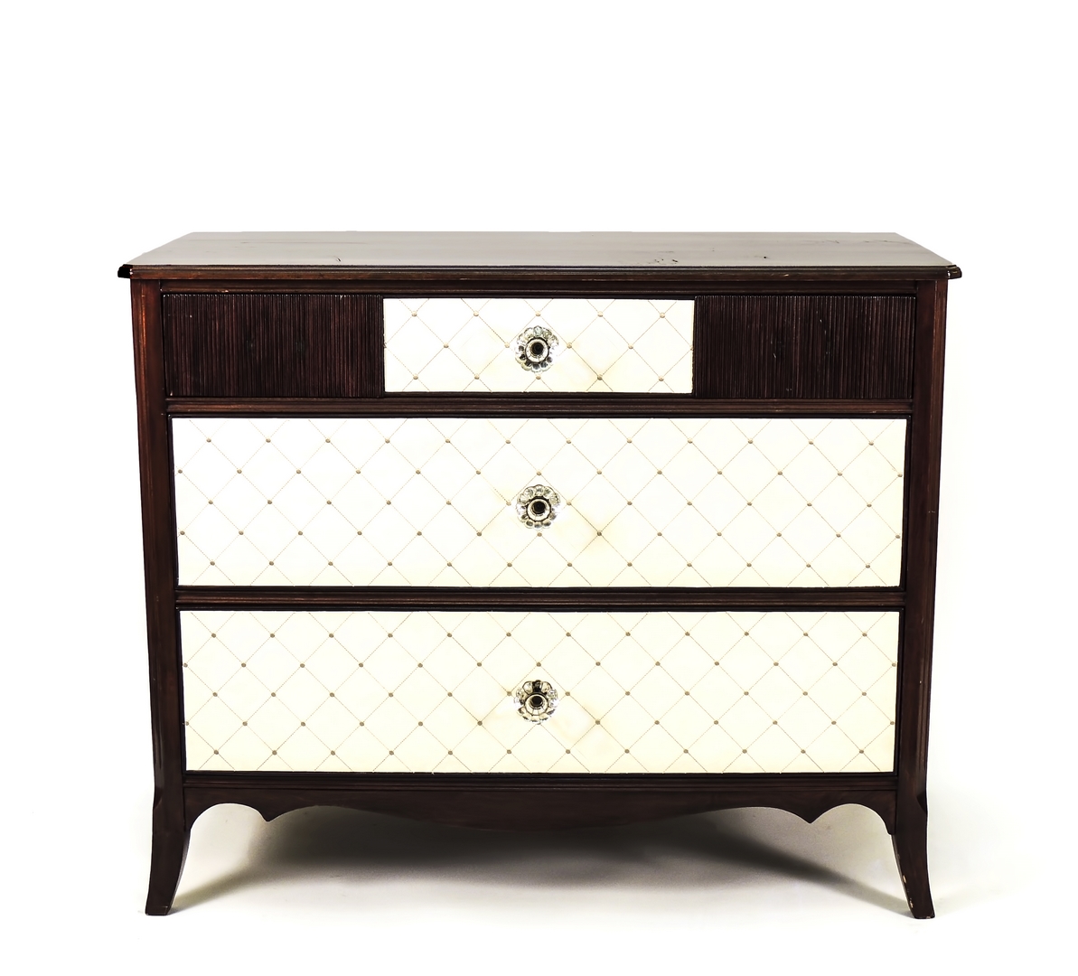 PICCOLO CASSETTONE IN PALISSANDRO - SMALL ROSEWOOD COMMODE Anni Cinquanta - Fifties tre cassetti sul fronte dritto rivestiti in similpelle bianca, pomelli in plexiglass, pendagina mossa, gambe a sciabola h cm 88x107x48,5