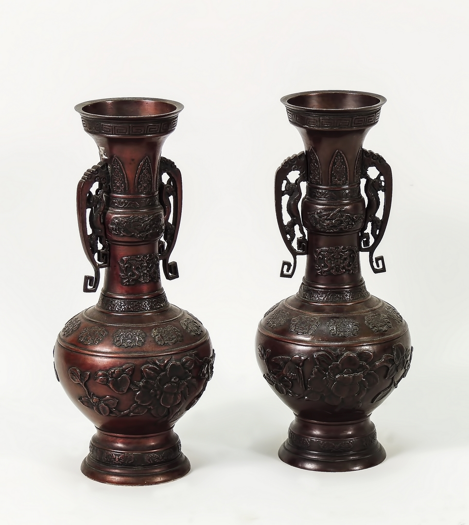 COPPIA DI VASI IN BRONZO - PAIR OF BRONZE VASES Cina, XIX secolo - China, 19th Century corpo bombato sbalzato con fiori, alto collo sbalzato con animali e motivi fantastici, prese a voluta stilizzata