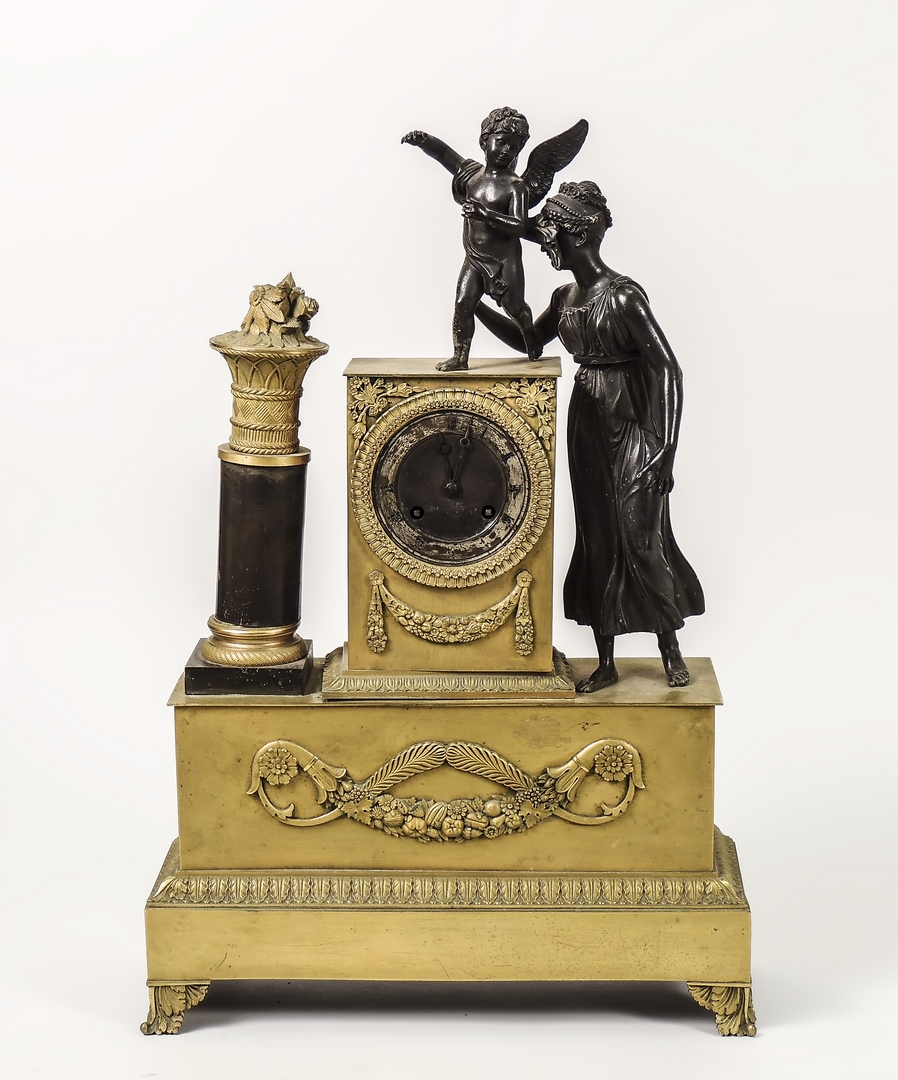 OROLOGIO IN BRONZO DORATO - BRONZE MANTEL CLOCK Francia, prima metà del XIX secolo - France, first half of 19th century sbalzato con ghirlande e festoni di fiori e sormontato da Venere con Amorino, base a plinto, su piedini modellati come foglie d'acanto h cm 56