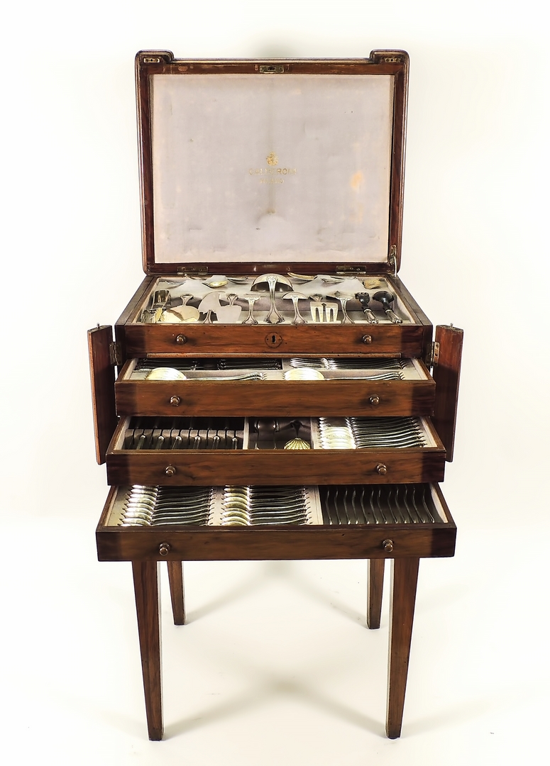 GRANDE SERVITO DI POSATE IN ARGENTO - SILVER CUTLERY SET Calderoni Milano, prima metà del XX secolo - first half of 20th century completo per dodici persone, manici sbalzati da volute vegetali, corredato da numerose posate da portata, contenuto nella sua cassettiera originale in noce, quattro cassettini sul fronte, poggiante su di un tavolino en pendant con alte gambe a faretra (201) gr 8790
