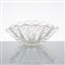 Una coppa in vetro trasparente bullicante, costolature verticali, bordo ondulato, due anse.