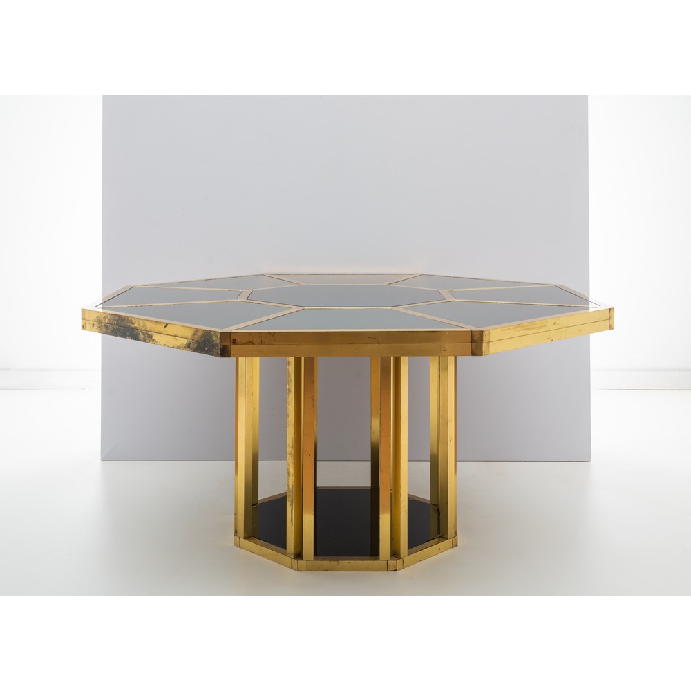 Tavolo da pranzo modello “Topazio”, struttura in ottone, piano ottagonale composto da lastre in vetro nero, base ottagonale.