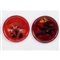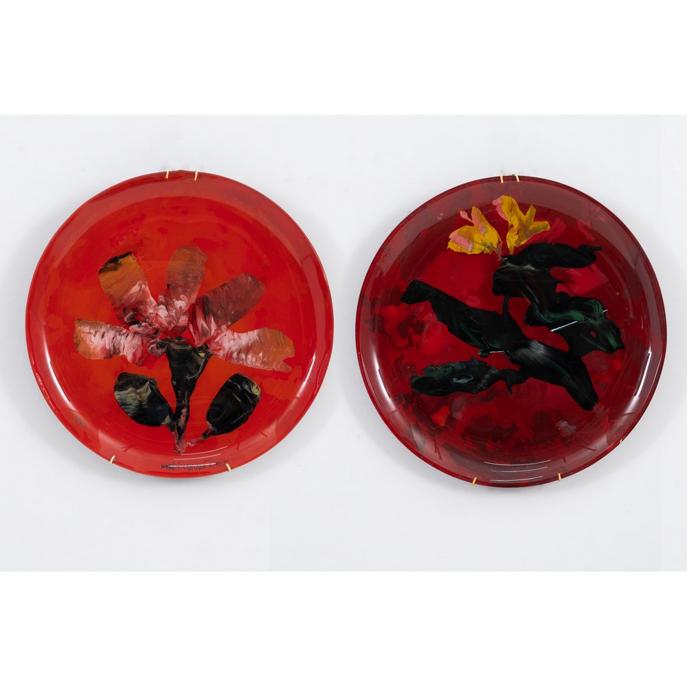 Due piatti circolari in vetro decorato a smalti con motivi floreali policromi su fondo rosso, uno reca la scritta Fontana Arte e la firma dell'autore.