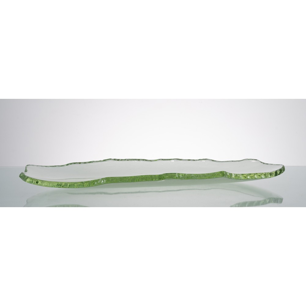 Grande e raro centrotavola in cristallo verde Nilo di grosso spessore, corpo ovalizzato lievemente curvato, bordi tagliati a scalpello.