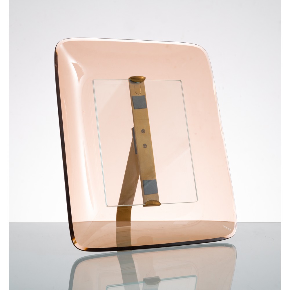 Cornice portafoto in cristallo curvato rosato, struttura in ottone.