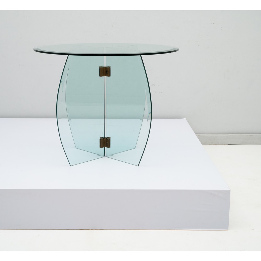Tavolo in cristallo molato, ottone, piano circolare, piede composto da quattro lastre sagomate. Due sbeccature nel piano.