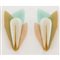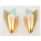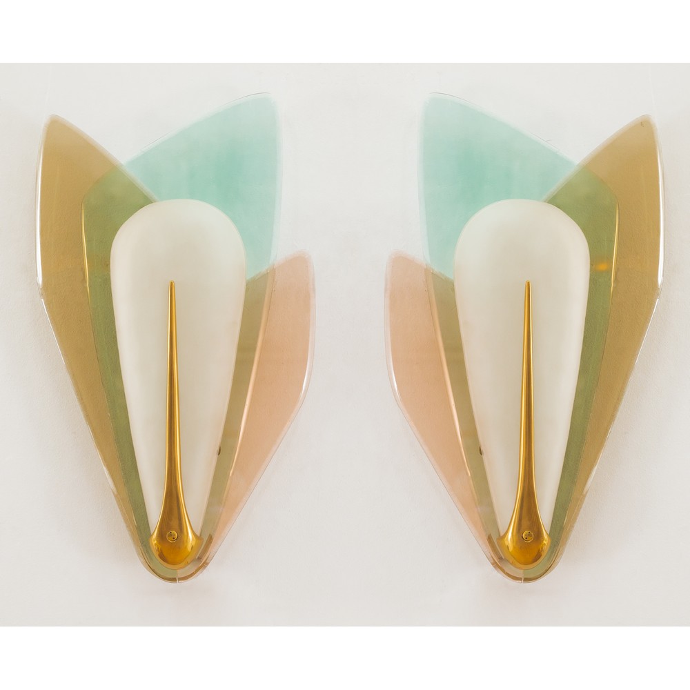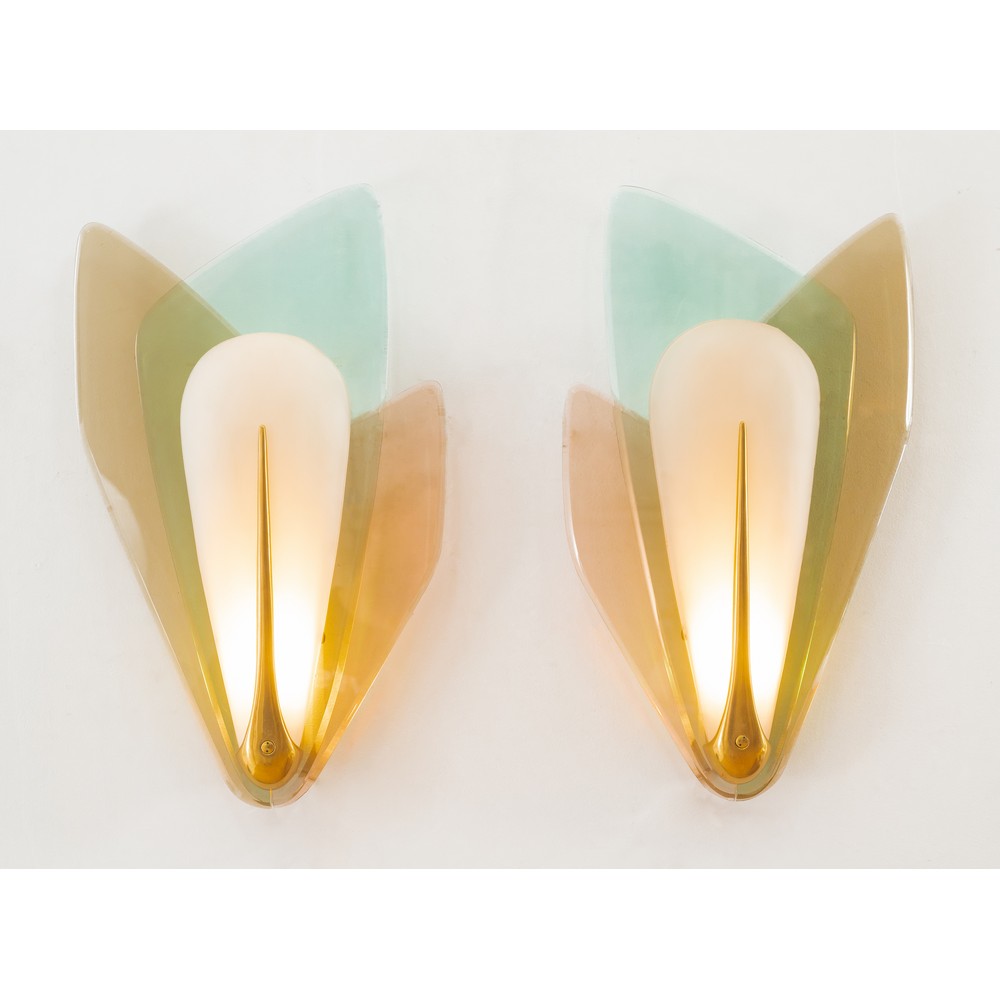 Rara coppia di lampade da parete ad una luce in cristallo sagomato rosato, verde e bronzo, diffusore curvo in cristallo satinato, ottone.