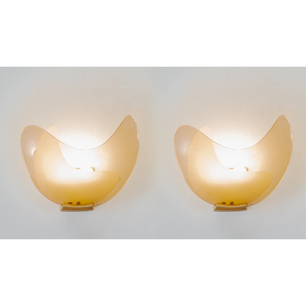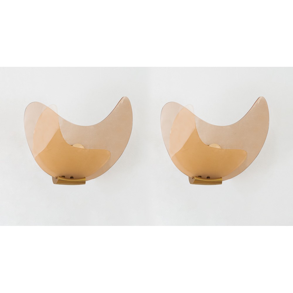 Rara coppia di lampade da parete ad una luce, diffusore a spicchio di luna in cristallo rosato e satinato, struttura in ottone.