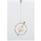 Lampada a sospensione ad una luce modello “Saturno”, diffusore sferico in vetro rosa con disco ad anello in vetro trasparente, struttura in legno e metallo, freccia in metallo cromato.