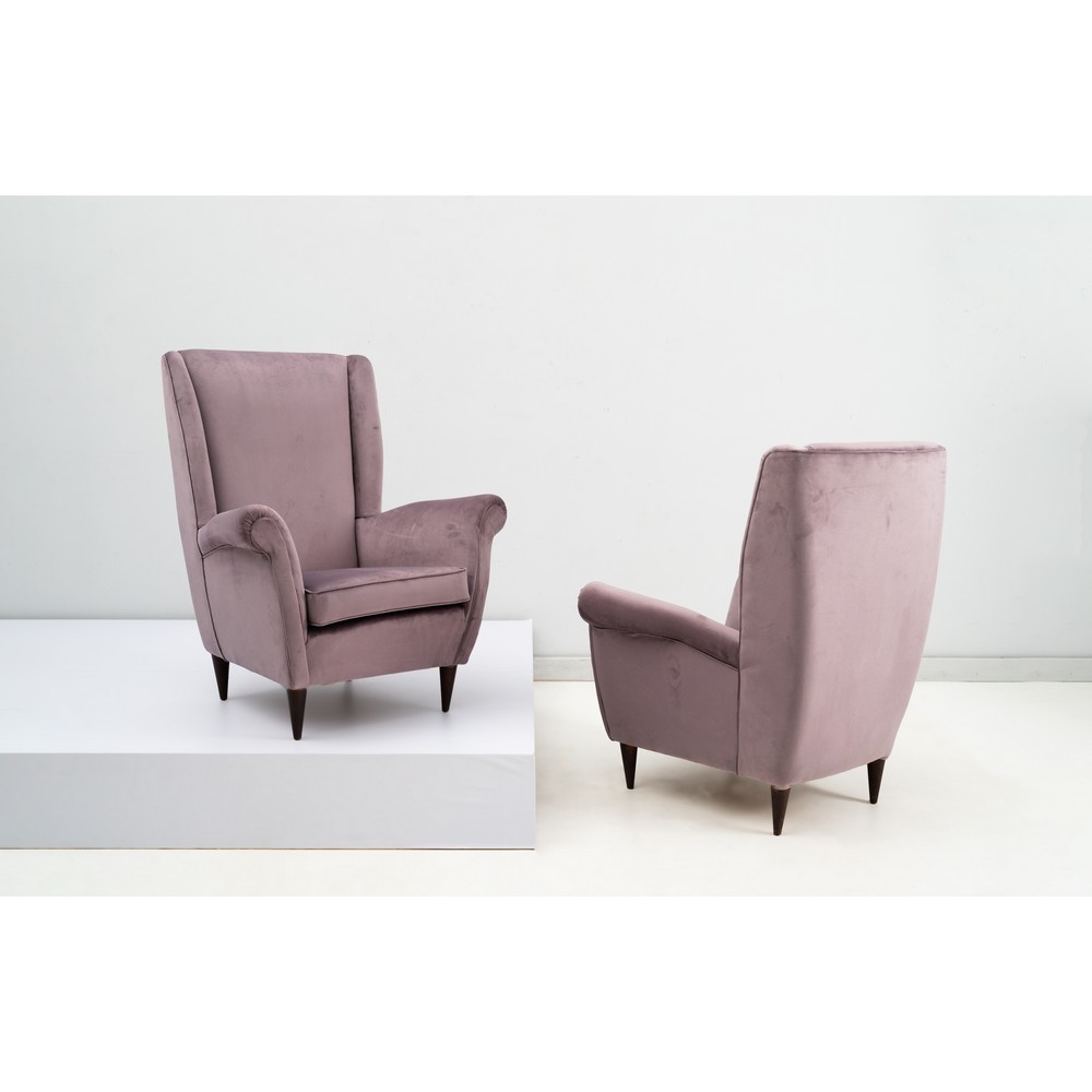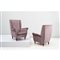 Coppia di poltrone modello “512”, struttura in legno con imbottitura e rivestimento in velluto lilla.