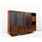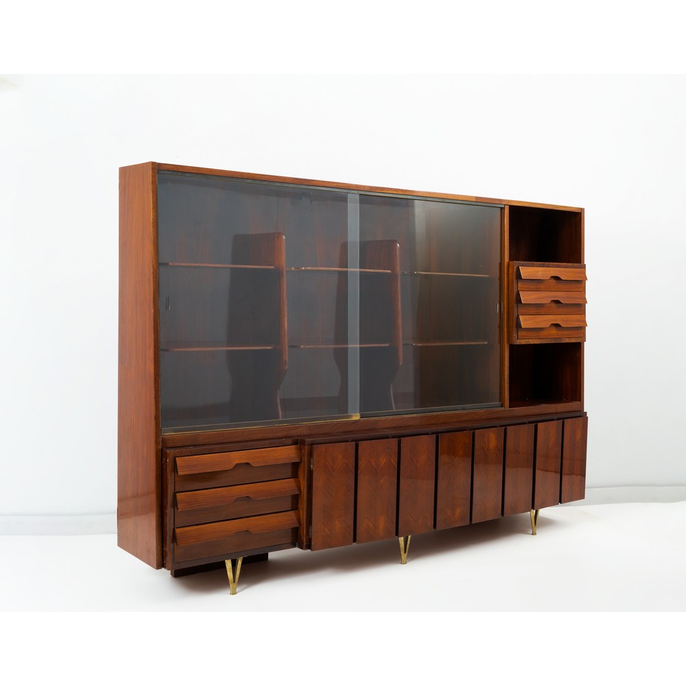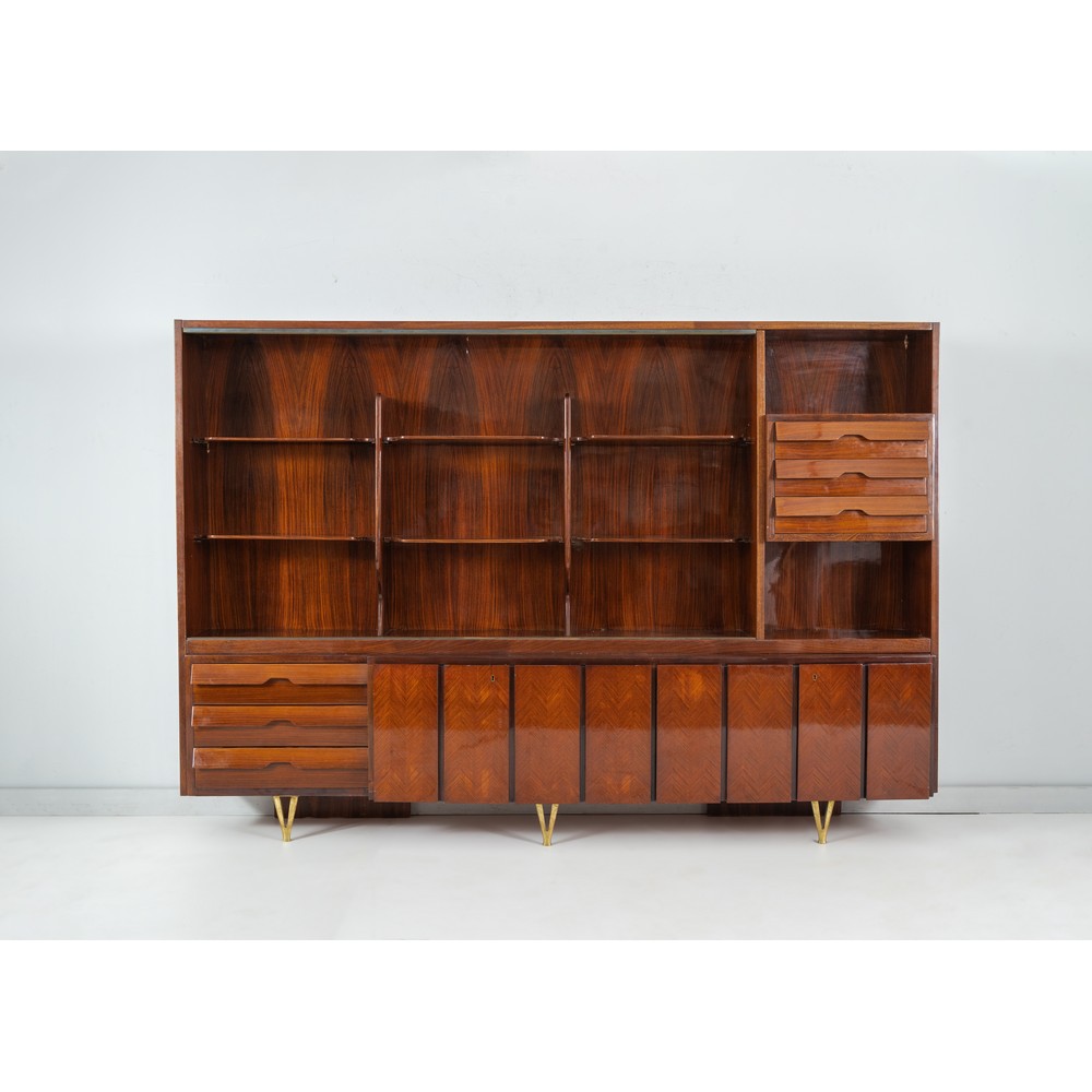 Importante e rara grande libreria realizzata per Luigi Fontana e le sedi di Fontana Arte, struttura in legno esotico, nella parte superiore un vano chiuso con vetri scorrevoli diviso in tre parti con due ripiani, lateralmente due vani a giorno con cassettiera centrale a tre cassetti; nella parte sottostante tre cassetti e due vani chiusi con ante battenti. Tre piedi a “V” in ottone sul fronte.