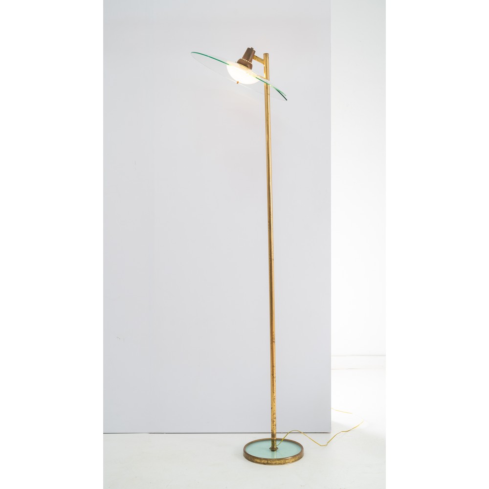 Rara lampada da terra ad una luce, struttura in tubolare di ottone, diffusore a disco in cristallo trasparente e cristallo satinato semisferico, base circolare in cristallo verde Nilo e ottone. Lampada su commissione.