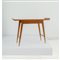 Consolle in legno di attribuita a Chiesa, struttura in massello di noce, piano rettangolare con estremi curvati, cassetto centrale sul fronte, gambe inclinate, puntali in ottone.