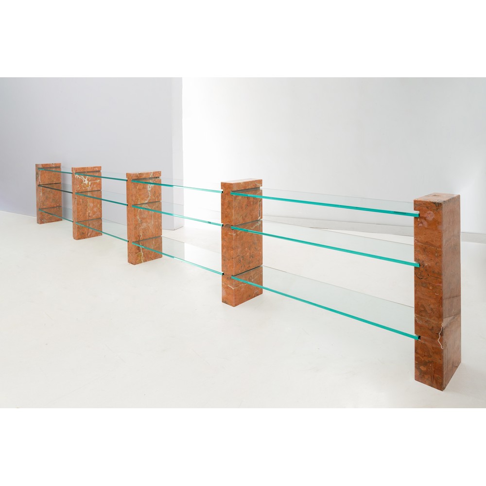 Libreria modello “Cidonio” della serie Fucina con struttura in marmo rosso. Ripiani in cristallo trasparente. Difetti e piccole sbeccature nel marmo.