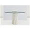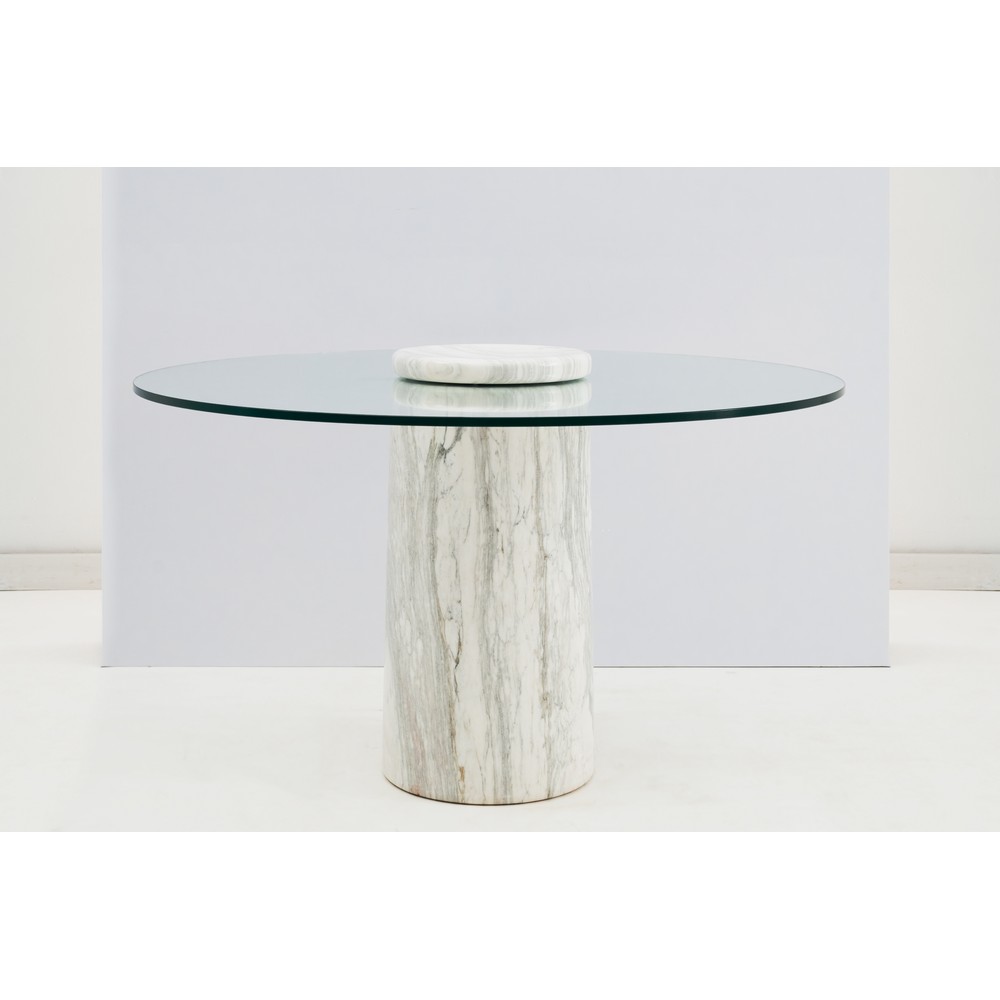 Tavolo da pranzo in marmo bianco venato di grigio, piano circolare in vetro trasparente, vassoio in marmo.