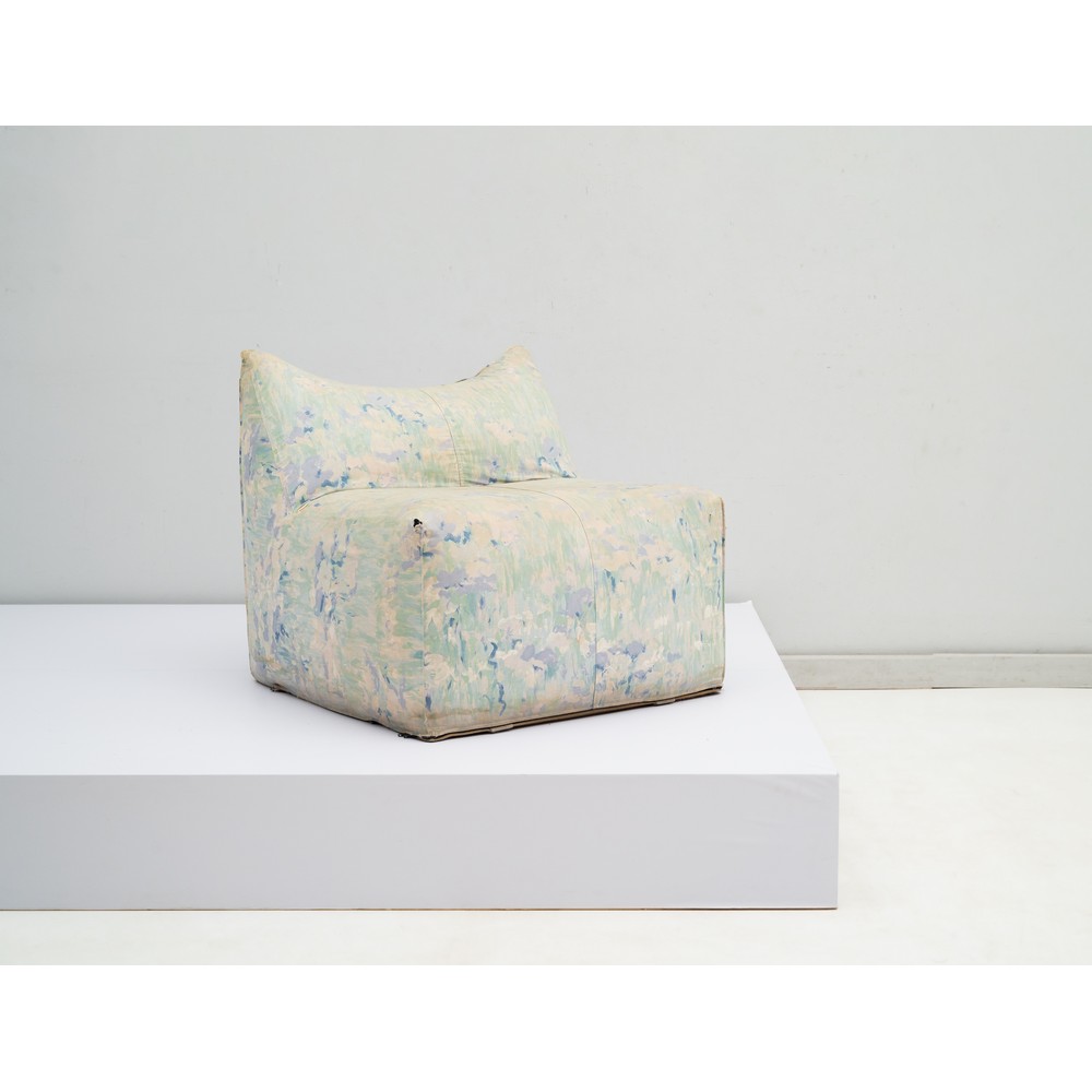 Poltrona ad un posto modello "Le bambole", Compasso d'Oro nel 1979, struttura in legno con imbottitura in schiuma di poliuretano e rivestimento in tessuto a fantasia astratta celeste e viola. Tessuto originale con difetti.
