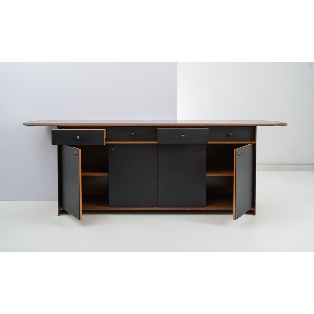 Sideboard serie “Artona”, piano ovale in radica di noce, bordatura in massello precomposto a corona sul piano, sul fronte due vani con mensola chiusi con quattro ante battenti in legno rivestito in cuoi nero e quattro cassetti.