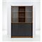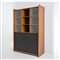 Mobile contenitore serie “Artona”, in legno di noce stratificato, cuoio e legno laccato nero, sul fronte nella parte inferiore vano chiuso con tre ante battenti in legno in cuoio nero, nella parte superiore tre vani a tre scomparti di cui due chiusi con anta battente in vetro e uno a giorno.