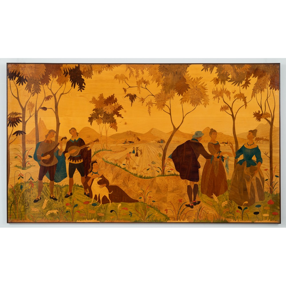 Grande panello raffigurante scena galante in paesaggio bucolico, tarsie di legni mischi policromi.