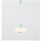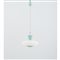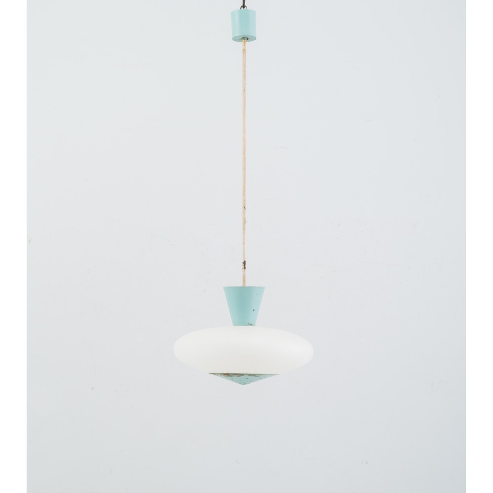 Lampada a sospensione ad una luce, struttura in metallo verniciato celeste, ottone, diffusore sferico schiacciato in vetro opalino