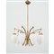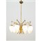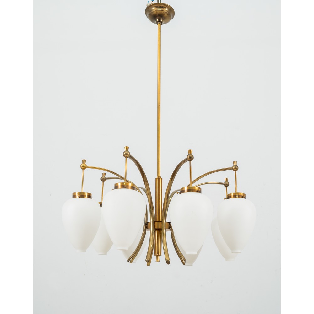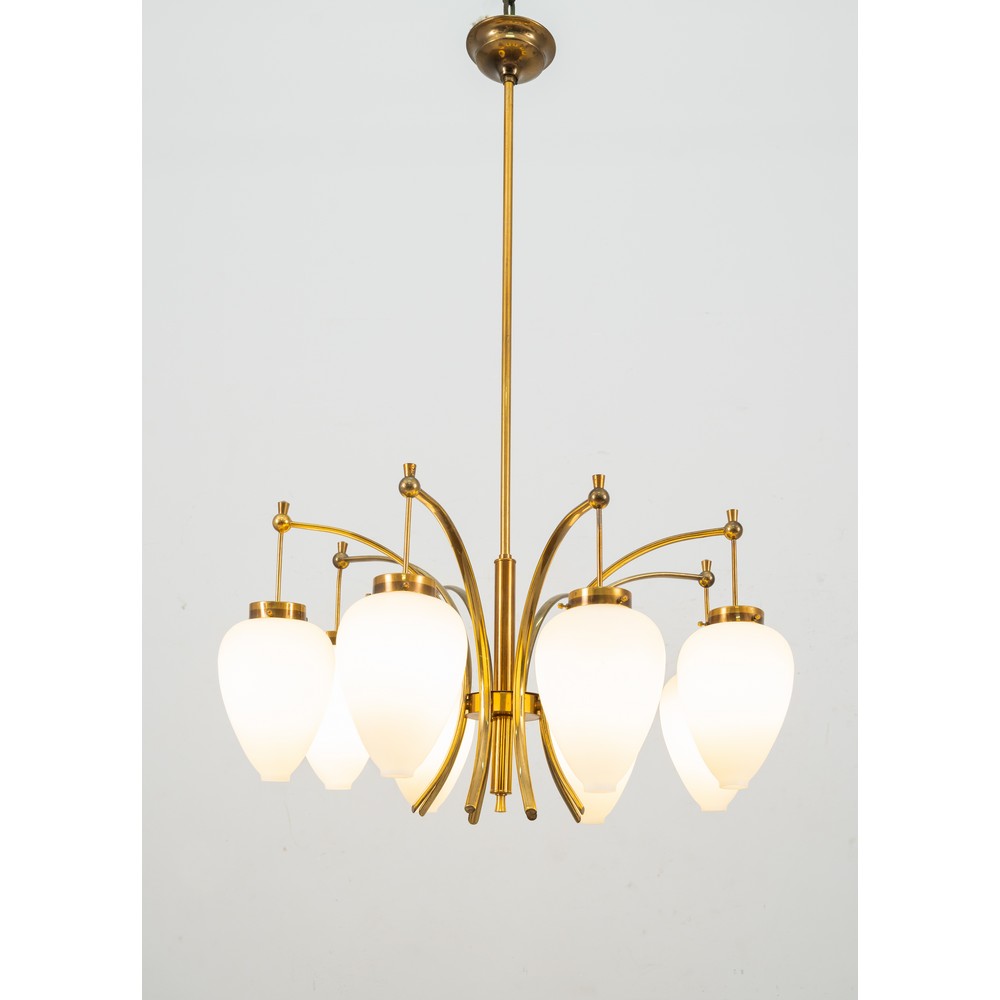 Lampada a sospensione a otto luci, struttura in ottone e metallo verniciato, bracci curvati, diffusori ovalizzati in vetro opalino lattimo.