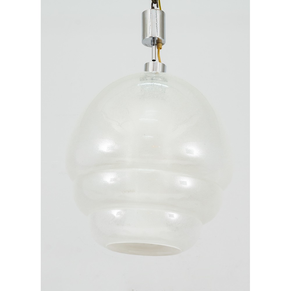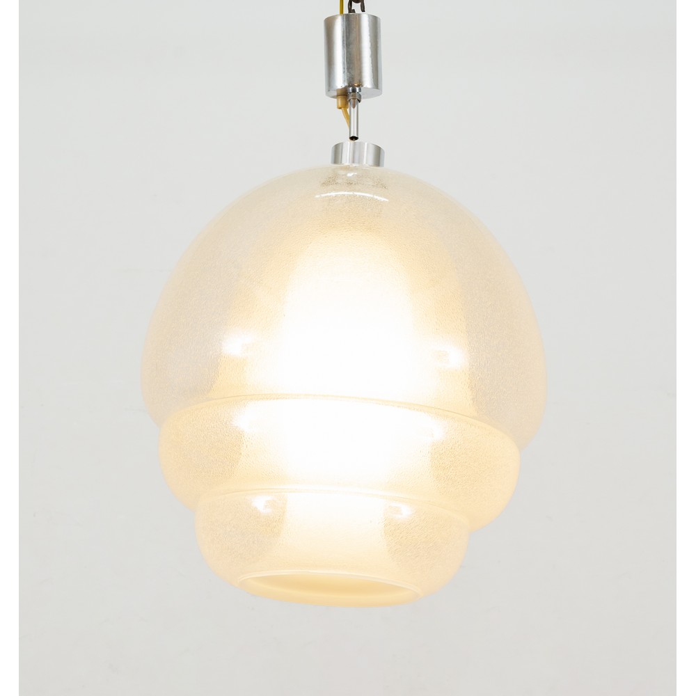 Lampada a sospensione modello “LS134” ad una luce, struttura in metallo e diffusore a quattro elementi sovrapposti in vetro pulegoso.