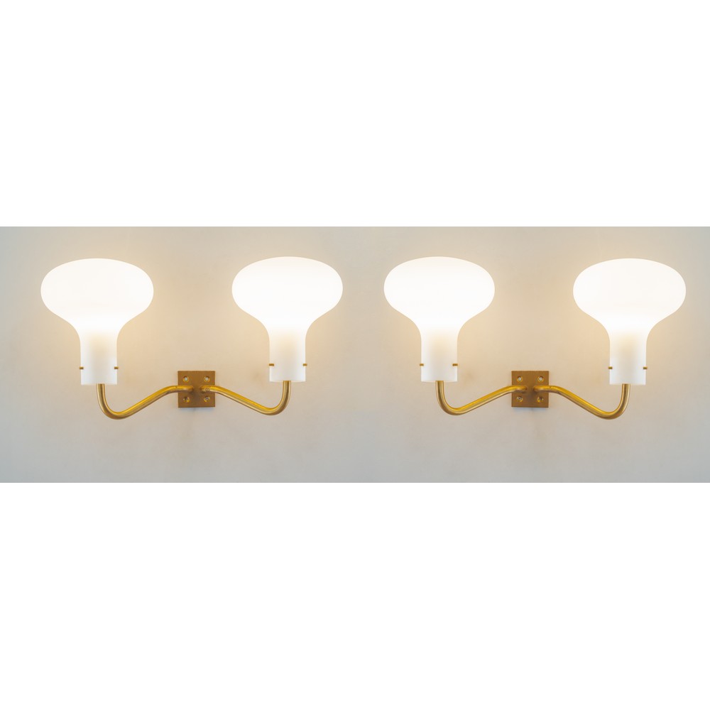 Coppia di lampada da parete a due luci modello LP12, diffusore a bulbo in vetro opalino e struttura in ottone. Modello Progettato per il PAC ‐ Padiglione di Arte Contemporanea, Milano.