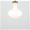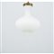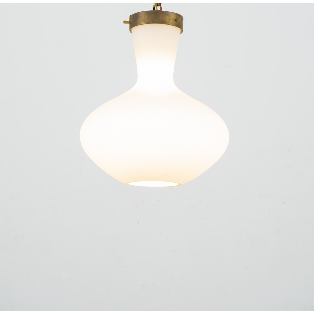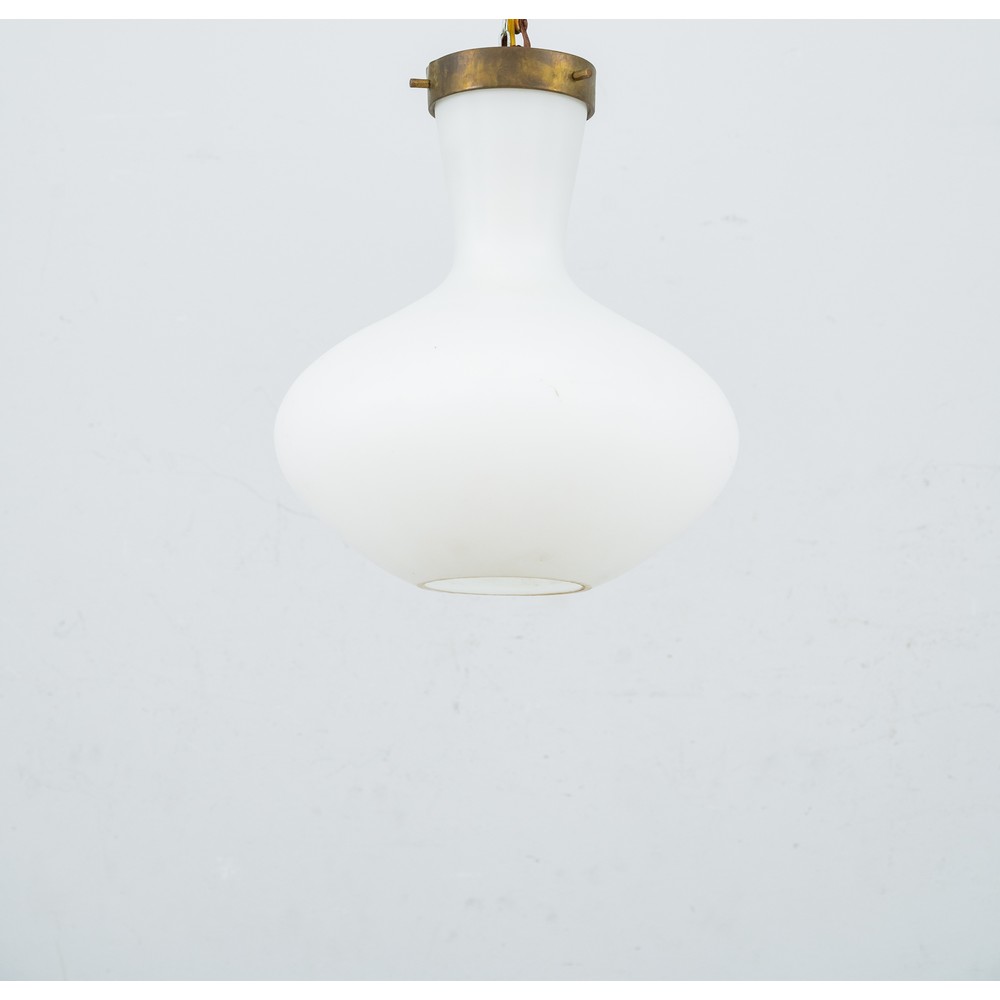 Lampada a sospensione ad una luce, struttura in ottone, diffusore sferico con lungo collo in vetro opalino. Etichetta di produzione.