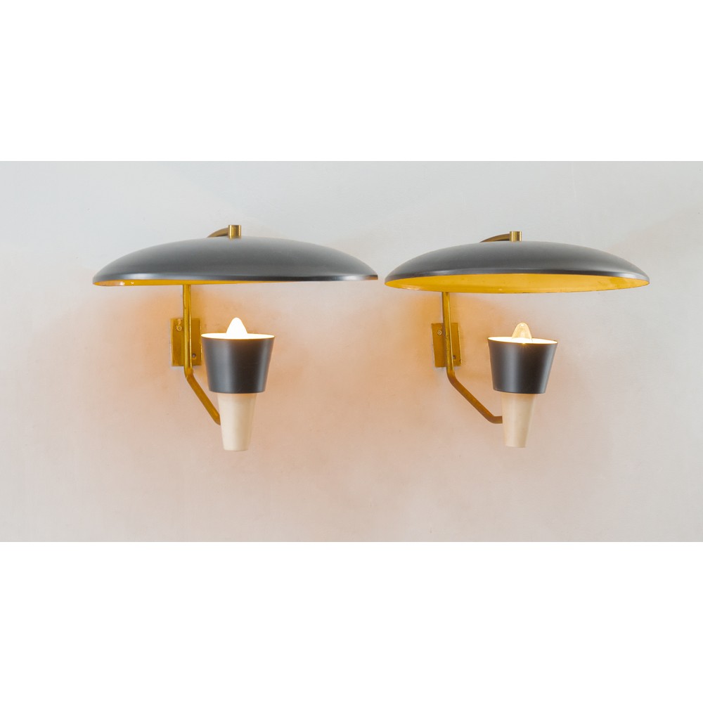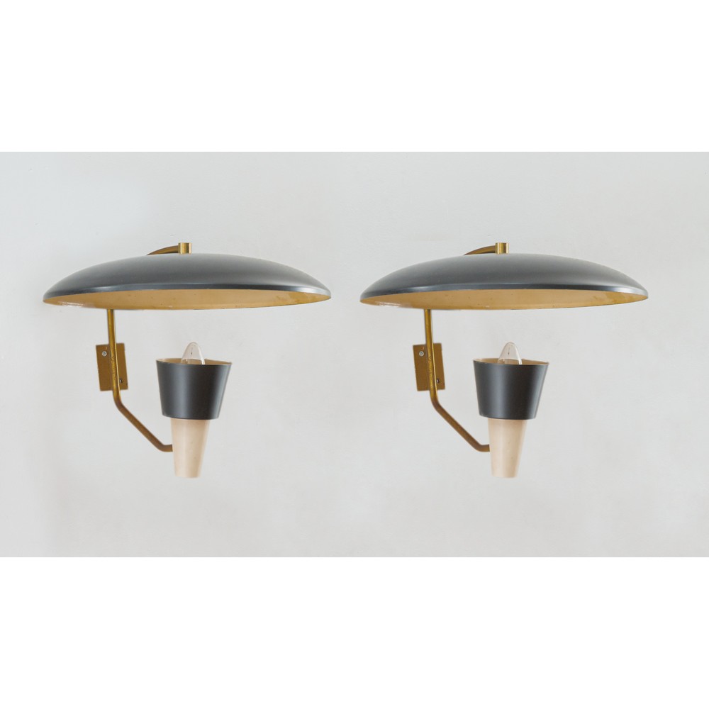 Coppia di lampade da parete ad una luce, struttura in ottone, diffusore sferico in metallo verniciato nero, porta lampada conico in metallo verniciato nero e bianco. Marchio di produzione.