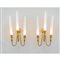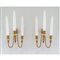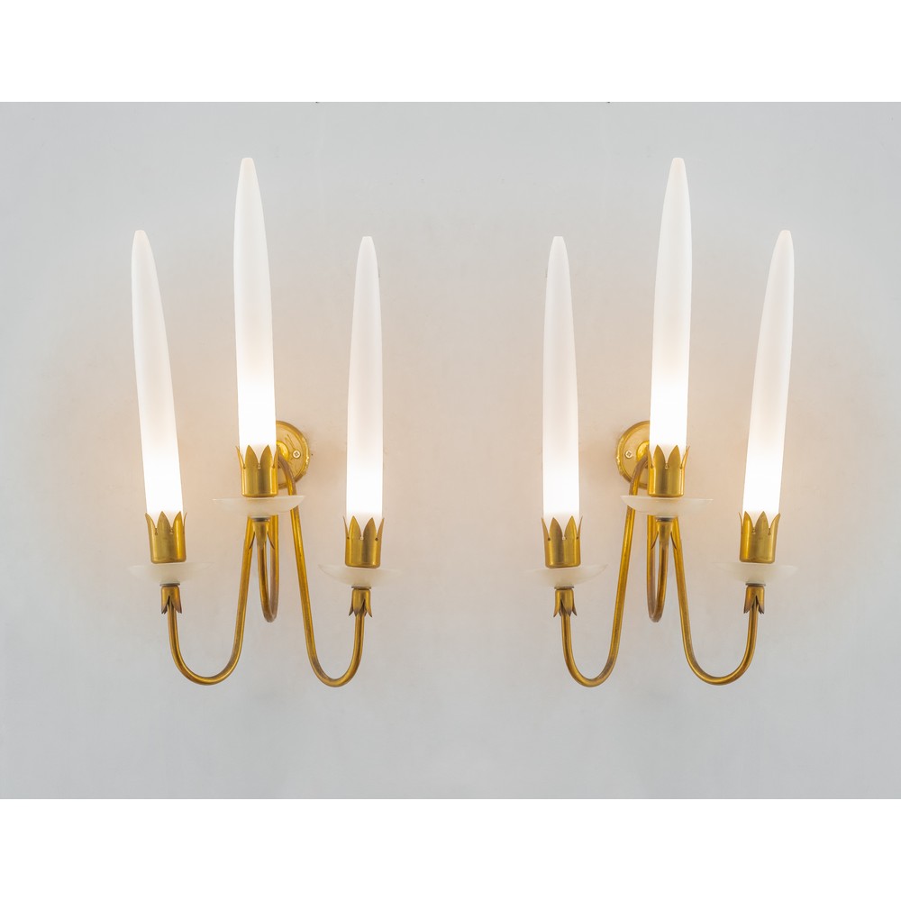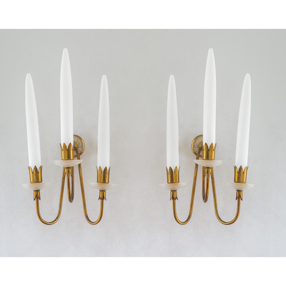 Coppia di lampade da parete a tre luci, struttura in ottone con diffusori a candela in vetro duplex opal bianco. Marchio di produzione.