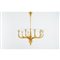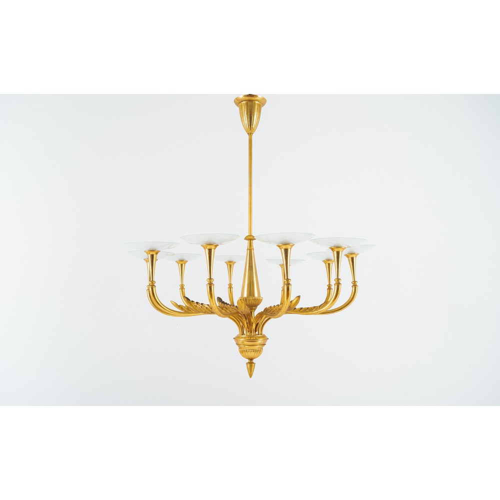 Lampada a sospensione a dieci luci, struttura in ottone con bracci ricurvi e decorati con foglie, diffusori a piatto in vetro satinato.