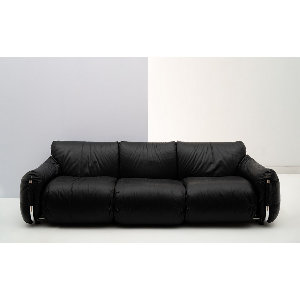 Divano a tre posti, struttura in tubolare di metallo cromato con imbottitura e rivestimento in pelle nera. Marchio di produzione (difetti alla pelle).