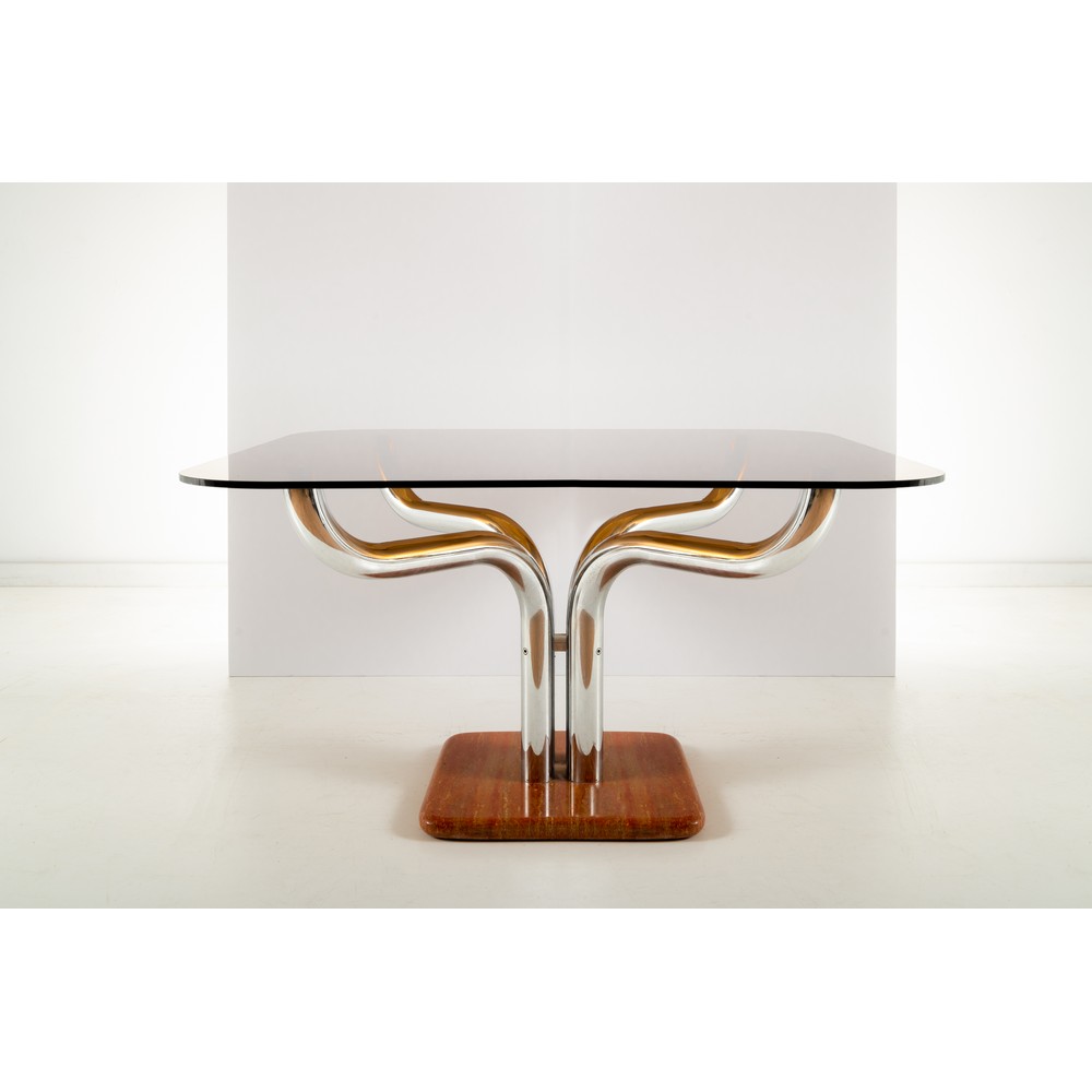 Tavolo da pranzo con struttura tubolare curvata, base in marmo, piano in vetro fumè.