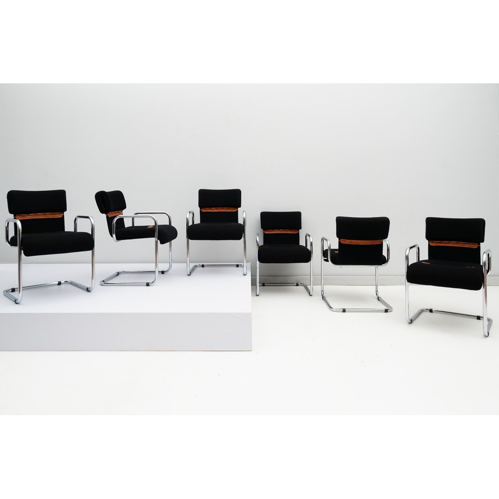 Sei sedie con struttura in tubolare metallico curvato e cromato, seduta e schienale imbottiti e rivestiti in fustagno nero con bordure in cuoio.