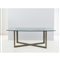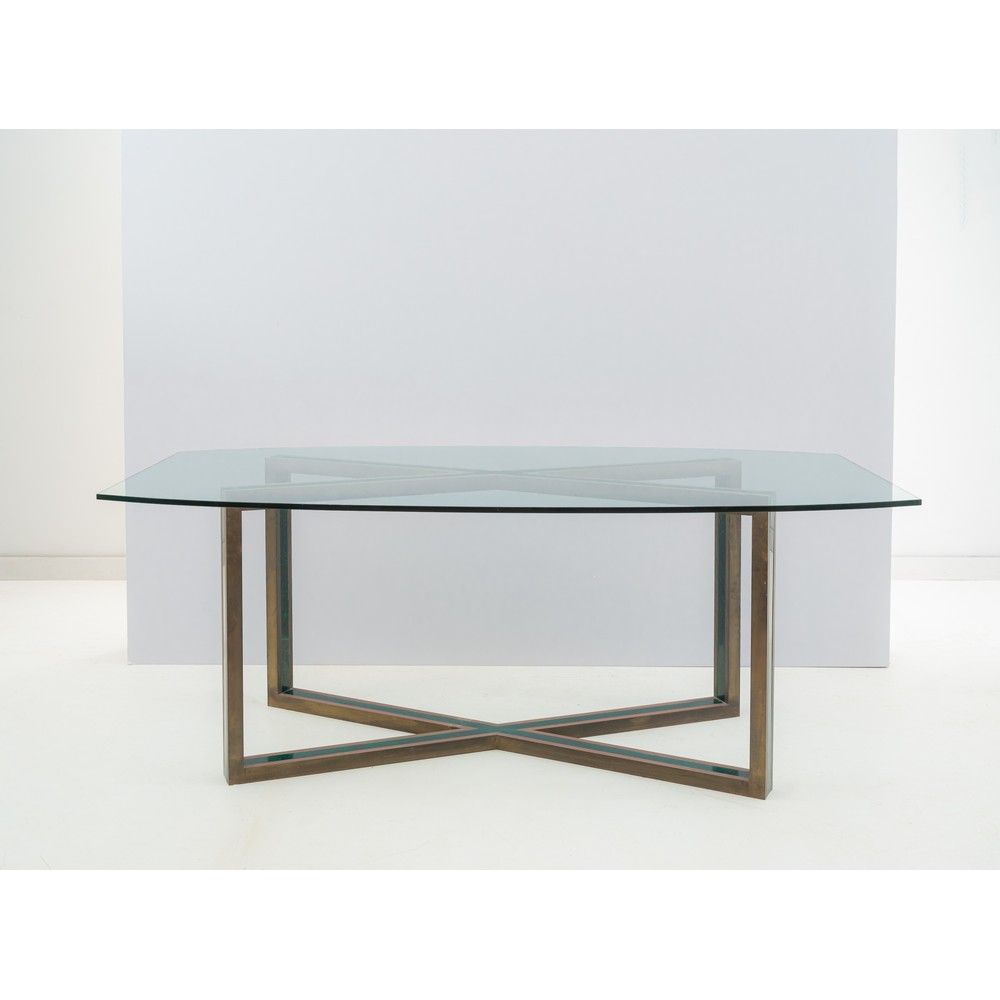 Tavolo da pranzo con struttura a telaio chiuso in ottone e marmo verde delle alpi, piano in vetro trasparente retto nei lati corti e curvato nei lati lunghi. Usure.