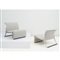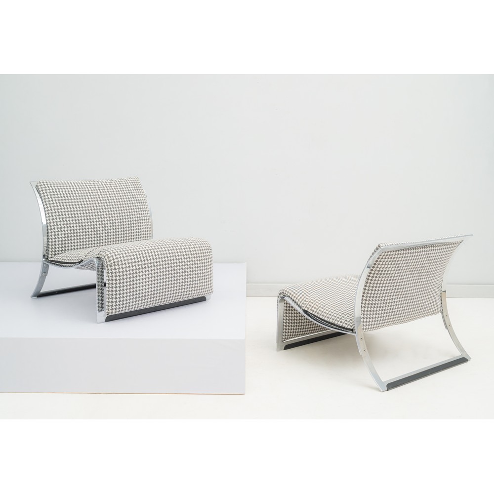 Coppia di poltrone con struttura in metallo cromato, spalliera e seduta con imbottitura e rivestite con tessuto a pied de poule bianco e nero.
