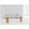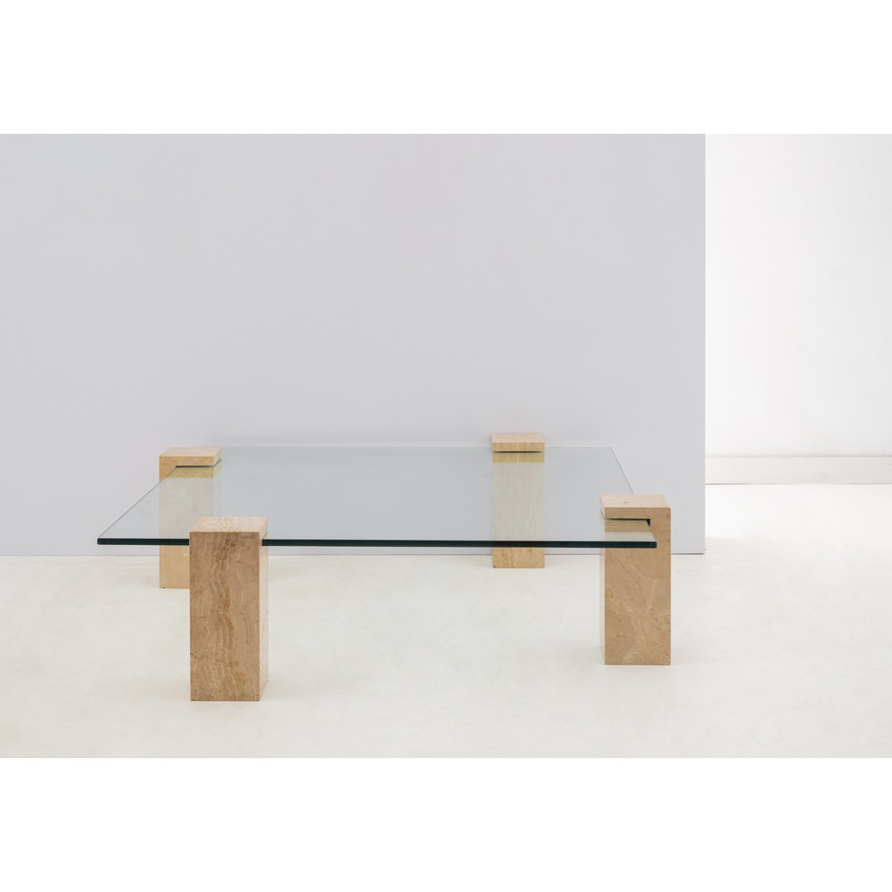 Tavolo basso composto da quattro piedi a parallelepipedo in travertino, piano quadrato in vetro di grosso spessore.
