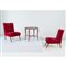 Due poltrone con struttura in legno, spalliera e seduta con imbottitura e rivestimento in tessuto di velluto rosso, piede a sciabola in legno. Un tavolo basso in legno di noce, piano circolare con vetro incassato, gambe curvate.